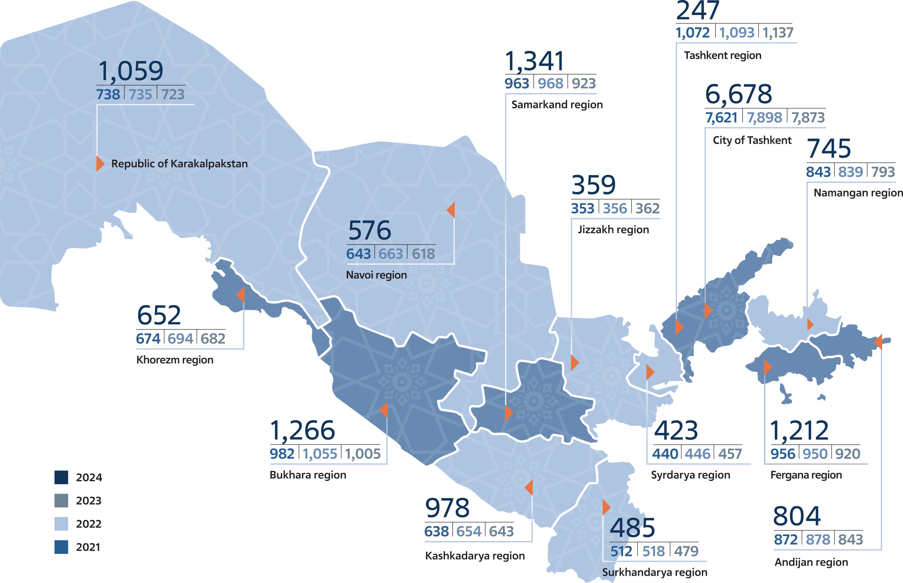 The company is represented in 14 major regions of the country, where it operates in the telecommunications industry. The largest number of employees is concentrated in the city of Tashkent, where the company’s head office is located, with a staff of 6,678 people.