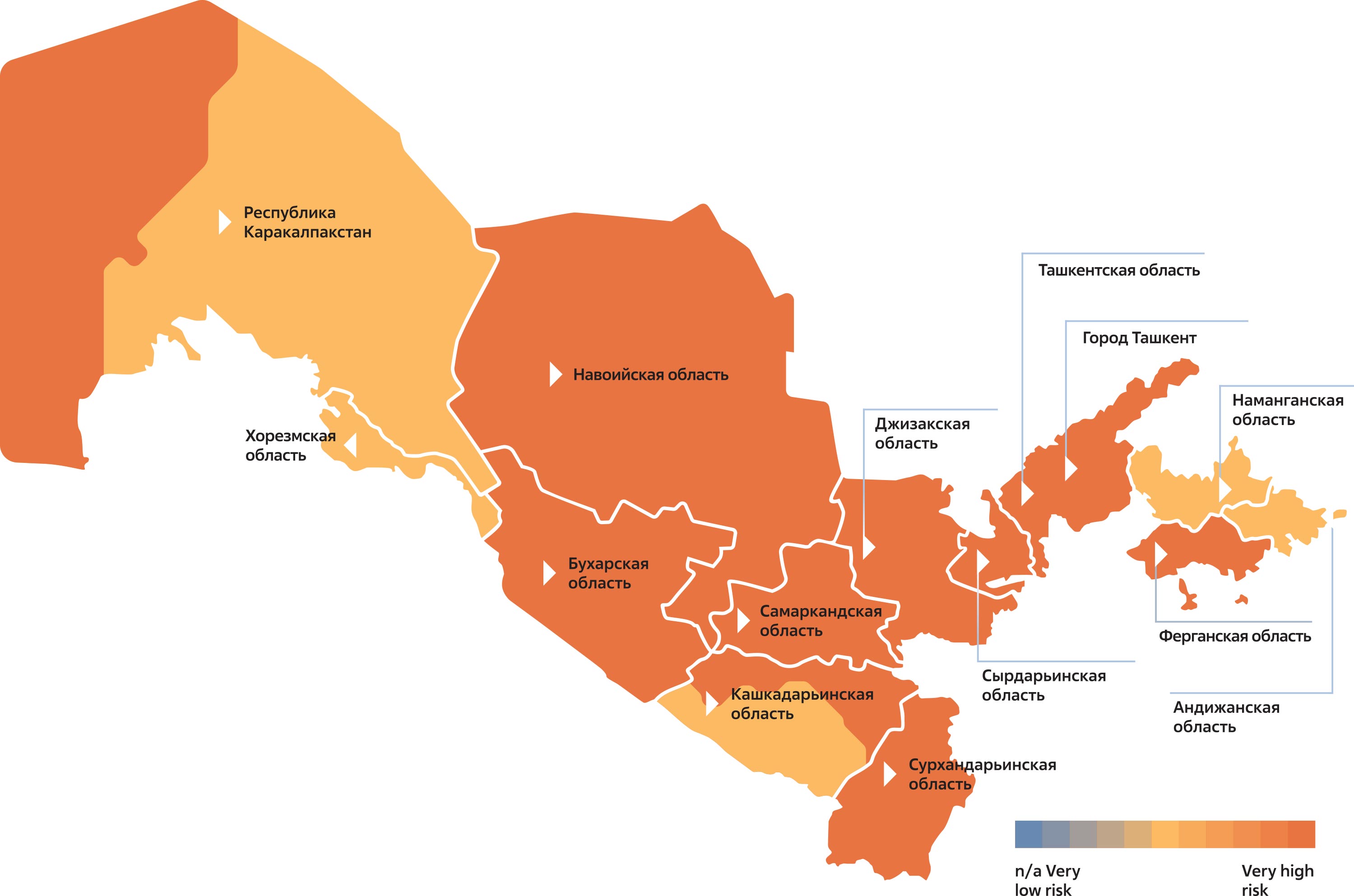 Согласно классификации WWF Water Risk Filter , на основе показателей потребления и возобновляемости водных ресурсов, большинство регионов Узбекистана находятся в зоне «экстремального водного стресса» (baseline water stress >80%).