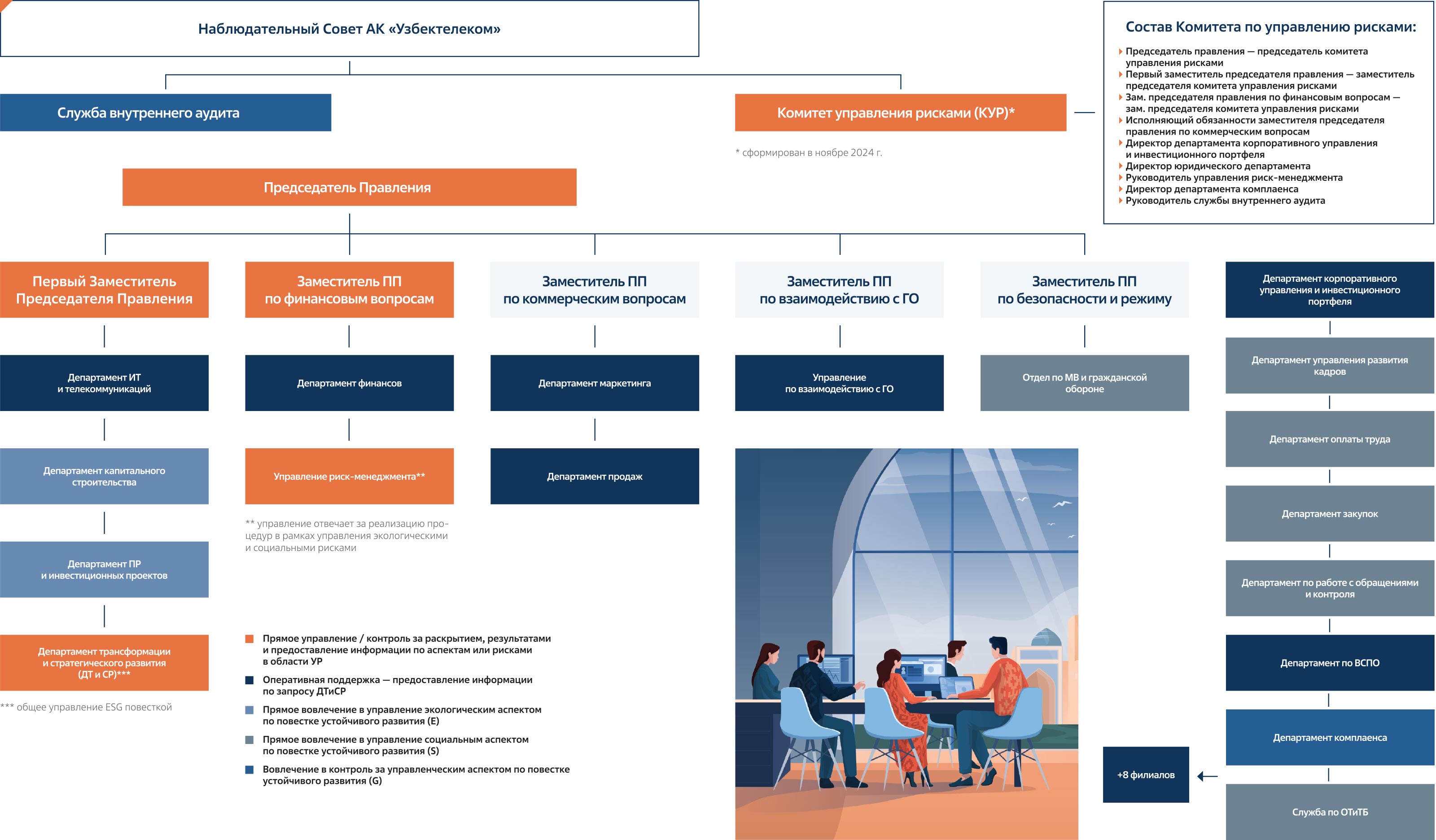 За управление экологическими и социальными аспектами в АК «Узбектелеком» отвечают два ключевых звена: на корпоративном уровне это Комитет по управлению рисками, а на операционном — Управление риск-менеджмента.