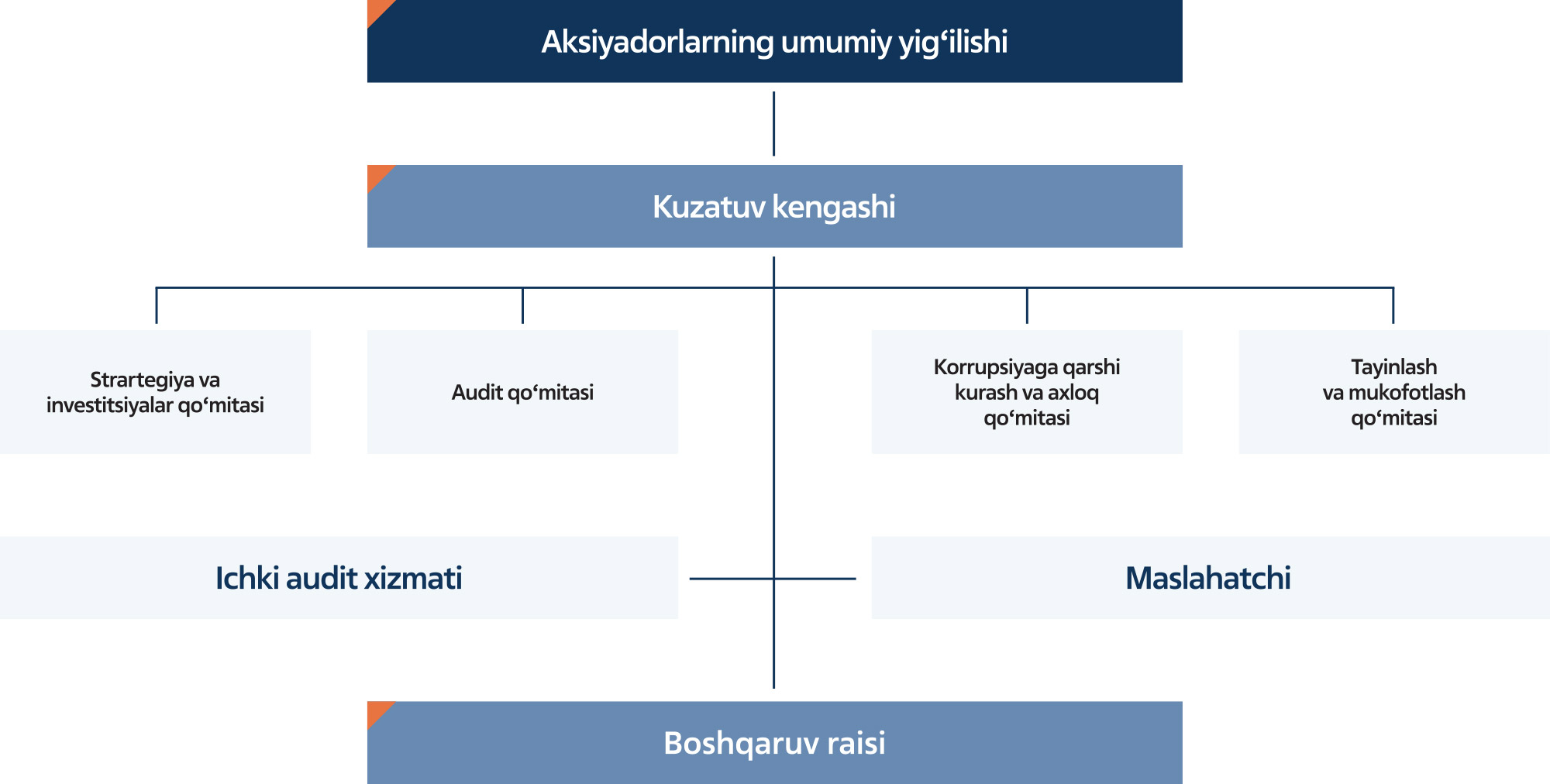 2024-yilda Kompaniya samarali korporativ boshqaruv tamoyillariga rioya qilishda davom etdi va uni barqaror rivojlanishning uzviy qismi sifatida qabul qildi. Boshqaruv tizimi shaffoflik, hisobdorlik va barcha manfaatdor tomonlar bilan o‘zaro konstruktiv hamkorlikni ta’minlashga yo‘naltirilgan.